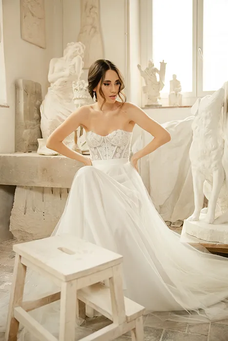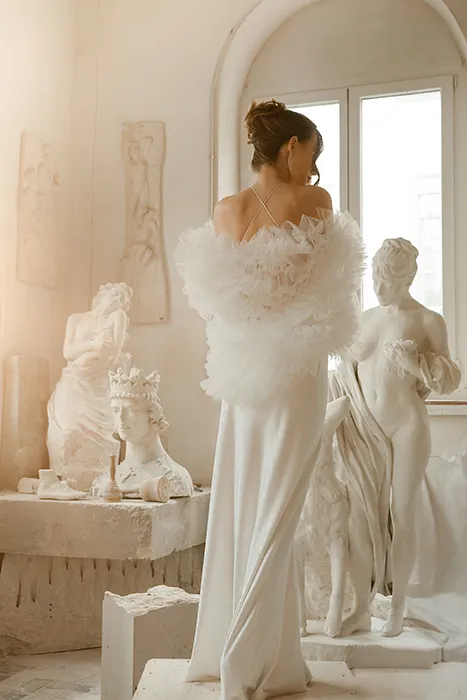 Dieses Shooting verkörpert pure Eleganz und Schönheit, inspiriert von einer mystischen Atmosphäre, die Brautmode und Kunst auf eine besondere Weise hervorhebt. Es erzählt die Geschichte von Adeline, die sich mit einer Mischung aus Eleganz und Verspieltheit durch das Steinhauer Atelier bewegt. Inmitten rohen Steins, handwerklicher Präzision und einer klaren künstlerischen Vision spürt sie die Magie des Moments und lässt sich von der Kreativität des Ortes leiten. Umgeben von sorgfältig ausgewählten Brautkleidern – von edlen Materialien bis hin zu kunstvoll arrangierten Elementen – findet sie das perfekte Styling für sich, das ihre Persönlichkeit und ihre Wünsche widerspiegelt. Die Balance zwischen Raffinesse und Leichtigkeit wird zum Leitfaden für ihre Reise durch das Atelier. Ein besonderer Rahmen für ein besonderen Moment.