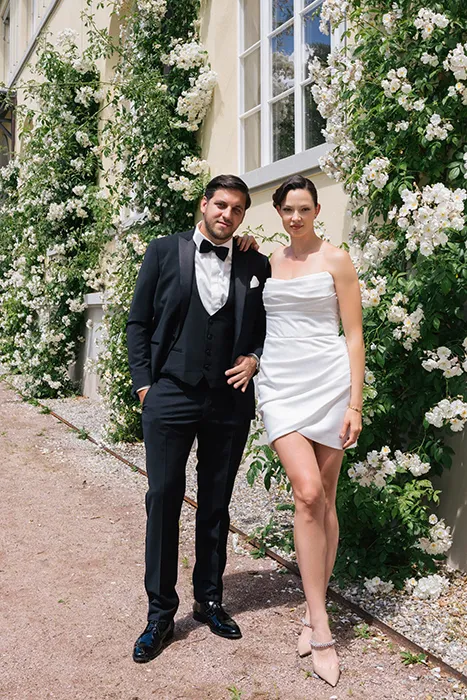 Im Mittelpunkt steht hier gleich mehreres: die Location, das Auto und die stilvolle Teezeremonie im Freien, die dem Setting eine ganz besondere, fast britische Stimmung verleiht. Alles wirkt fein, charmant und voller Persönlichkeit. Dazu passt auch das kurze Brautkleid perfekt: modern, feminin und mit einer frischen Leichtigkeit, die dem gesamten Look etwas Besonderes gibt.